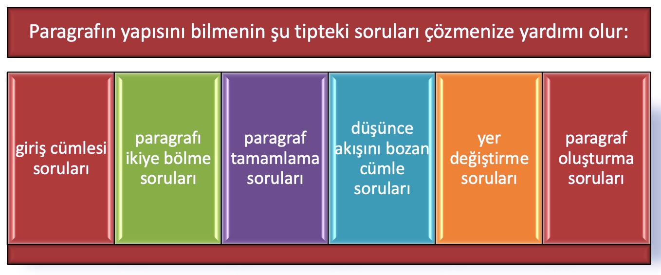 Bu tabloda belirtilen soru tiplerini çözebilmek, paragraftaki dil ve düşünce uyumunu iyi kavramaya bağlıdır. Bu tipteki soruları çözerken yukarıda anlatılanları temel almayı unutmayınız. Şimdi tablodaki konu başlıklarını kısaca açıklayalım: